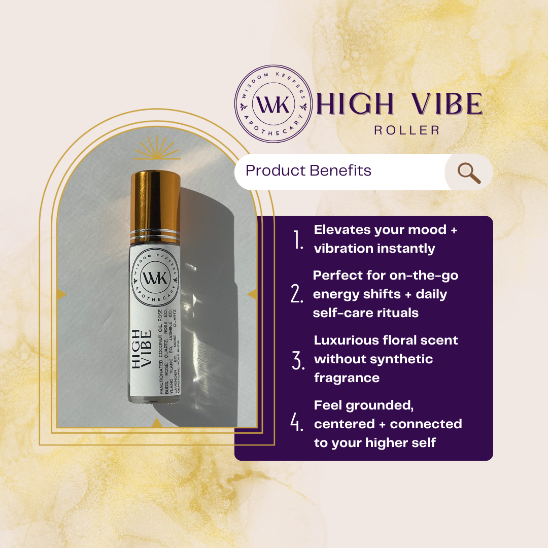 Whenever you need a vibrational boost, simply roll High Vibe onto your pulse points—wrists, neck, temples, or heart space—+ breathe it in deeply. Let the intoxicating floral aroma sweep through your senses + lift your energy instantly. It’s perfect for on-the-go energy shifts, prepping for meditation, or just creating a moment of pure, high-vibe magic throughout your day.
